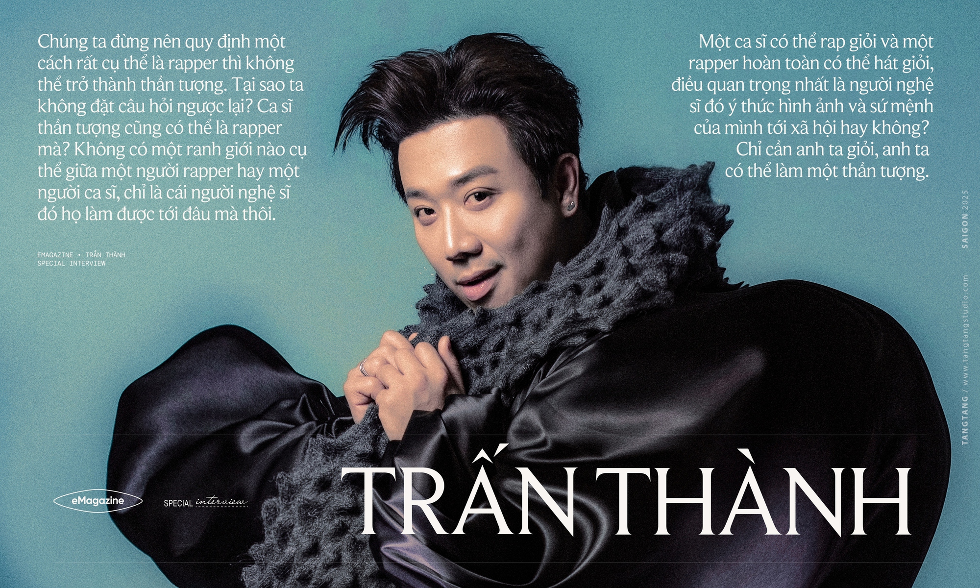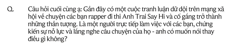 Tôi nghĩ thế này nè: Rapper mà trở thành thần tượng được hay không là do mỗi cá nhân họ. Nếu người đó chỉ biết rap thì rõ ràng họ là rapper rồi, nhưng nếu họ làm được nhiều hơn là rap, họ hát được, nhảy được, có vóc dáng và cả thời trang - tại sao họ không được quyền làm thần tượng? Chúng ta đừng nên quy định một cách rất cụ thể là rapper thì không thể trở thành thần tượng. Tại sao ta không đặt câu hỏi ngược lại? Ca sĩ thần tượng cũng có thể là rapper mà? Không có một ranh giới nào cụ thể giữa một người rapper hay một người ca sĩ, chỉ là cái người nghệ sĩ đó họ làm được tới đâu mà thôi. Một ca sĩ có thể rap giỏi và một rapper hoàn toàn có thể hát giỏi, điều quan trọng nhất là người nghệ sĩ đó ý thức hình ảnh và sứ mệnh của mình tới xã hội hay không? Chỉ cần anh ta giỏi, anh ta có thể làm một thần tượng.