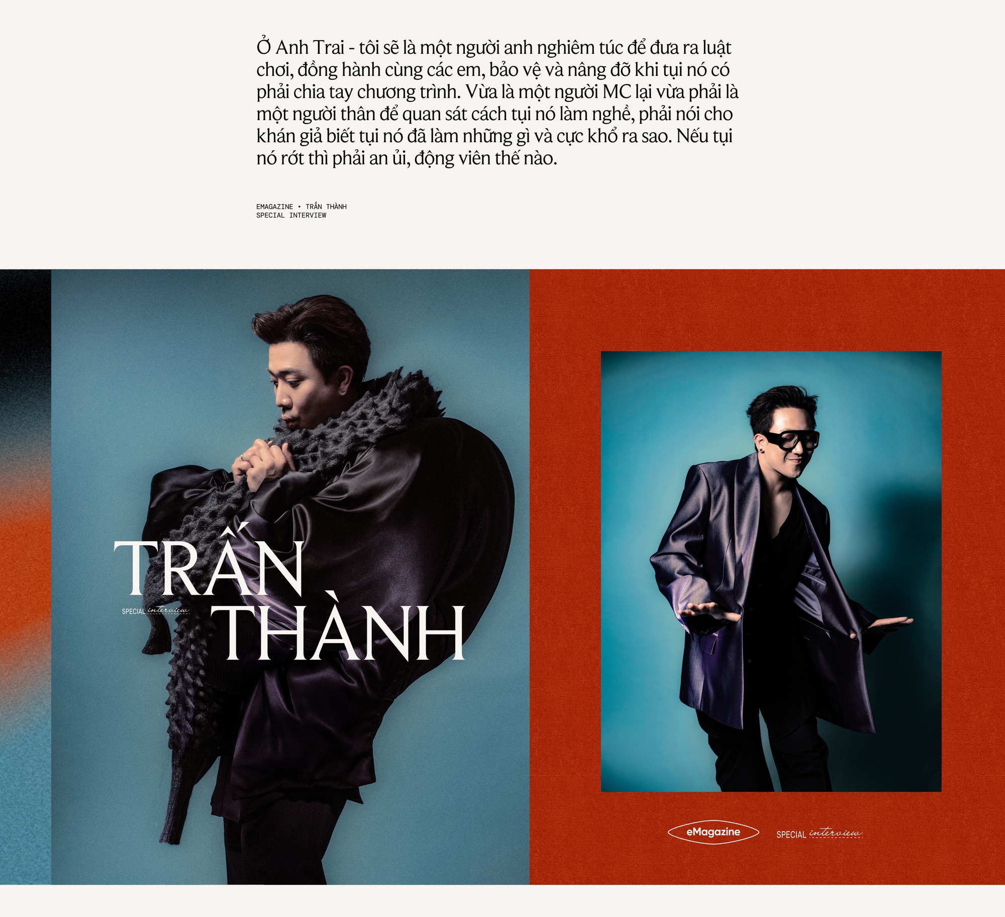 Thứ hai thì tôi nghĩ mình luôn có ý thức trong việc mình phải là những nhân vật khác nhau, trong từng chương trình khác nhau, ở từng vai trò khác nhau. Việc phải biến hóa thành những phiên bản khác biệt giúp tôi không lặp lại bản thân. Ở Anh Trai - tôi sẽ là một người anh nghiêm túc để đưa ra luật chơi, đồng hành cùng các em, bảo vệ và nâng đỡ khi tụi nó có phải chia tay chương trình. Vừa là một người MC lại vừa phải là một người thân để quan sát cách tụi nó làm nghề, phải nói cho khán giả biết tụi nó đã làm những gì và cực khổ ra sao. Nếu tụi nó rớt thì phải an ủi, động viên thế nào. Qua Running Man thì lại là một nhân vật khác, lầy lội, hài hước hơn. Tôi nghĩ, mỗi chương trình lại có một keyword để mình nắm được tinh thần chung của nó, bám vào đó để có thể đóng được nhiều vai trò khác nhau trong nhiều show khác nhau mà không bị lặp lại.