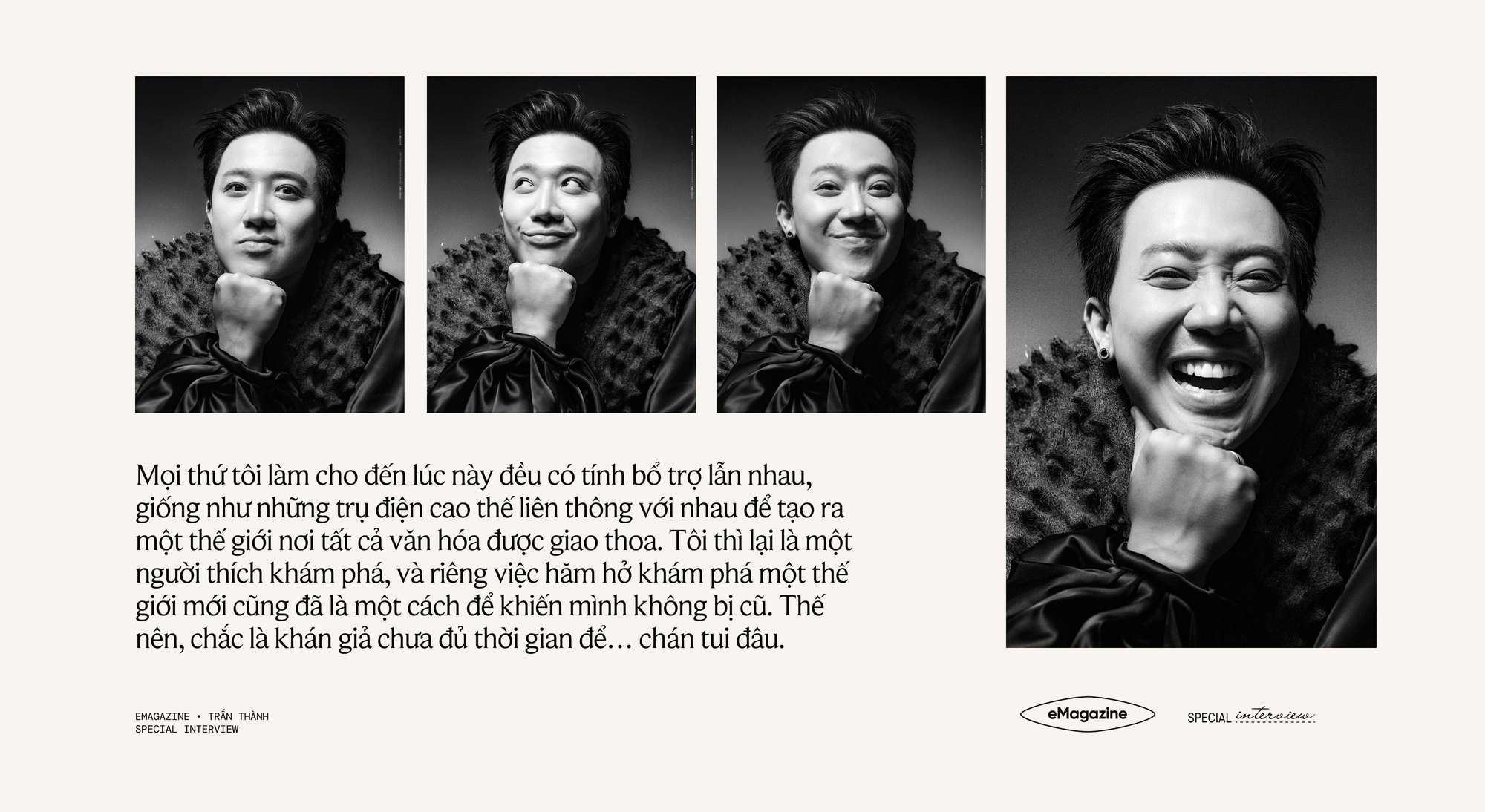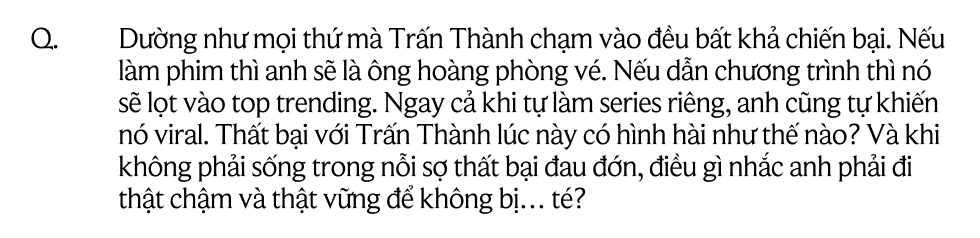 Có điều, điều kỳ diệu nhất không phải là Trấn Thành vẫn có nhiều sức để làm từng đấy việc, mà là anh vẫn… vui thật. Cái niềm vui đầy phấn khích của người biết mình đang ở đâu, và vẫn muốn thử khám phá còn có gì thú vị nữa để dấn thân. Ngày hôm trước anh nghẹn ngào đưa lời khuyên và chào tạm biệt một thí sinh trong Anh Trai Say Hi, hôm sau lại thành một đạo diễn nghiêm khắc trên set quay.