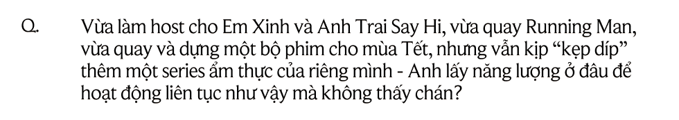 Theo kế hoạch, năm nay tôi chỉ tham gia dẫn Anh trai và Em Xinh Say Hi, Siêu Thực Thành được quay xen kẽ - và cũng là series của riêng mình nữa nên tôi có thể linh động được về lịch. Thỏ Ơi đã nằm trong kế hoạch trước đó, vậy nên tôi muốn dành toàn thời gian cho nó. Cho đến khi A.I là Ai xuất hiện - tôi lại nghĩ rằng chương trình đó quay cũng dễ và nhanh thôi nên gật đầu. Và rồi tới Running Man. Đối với tôi, đây là thử thách lớn nhất. Tôi biết mình cũng… có tuổi, từ khủng long xuống bò biển rồi. Sau 6 năm nghỉ ngơi, tôi cảm thấy rõ sức khỏe của mình đã thay đổi rõ rệt. Nhưng tôi cũng nhớ cảm giác được chơi, được nghe khán giả nói về mình, được tận hưởng những giây phút trong chương trình. Thế là lại… cắn răng nhận, và thật may mắn là hiệu ứng chương trình lẫn tình cảm của khán giả lớn tới mức tôi có thể cảm nhận được rõ rệt. Thôi kệ, cực chút xíu cũng chịu được ha!