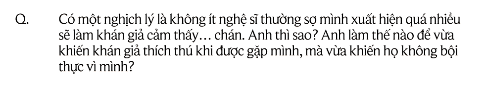 Tôi cũng muốn tự hỏi bản thân là tại sao mình lại phải làm nhiều như vậy? Có những lúc chợt nghĩ: "Mình có nhất thiết phải nhận nhiều show vậy hay không? Nghỉ ngơi một chút vẫn ổn hơn mà?". Nỗi lo lắng lớn nhất của tôi không phải là sợ mình làm không nổi, mà ví dụ như khi tham gia Running Man và phải vận động rất nhiều, nhỡ đâu bị trật tay, trật chân, bong gân, đứt dây chằng hay có một va chạm nào đó trên mặt - thì nào là sai raccord của phim, rồi không lên set quay Anh Trai Say Hi được thì mọi người sẽ phải trì hoãn. Rất nhiều tập thể sẽ phải tính toán lại phương án sản xuất và rời lịch vì những sự cố của mình. Thế nên đôi khi tôi thấy mình nhận lời tham gia nhiều chương trình như thế là cũng hơi… dại.