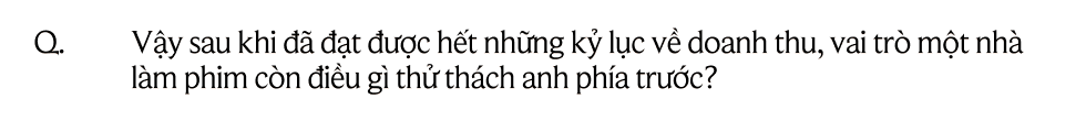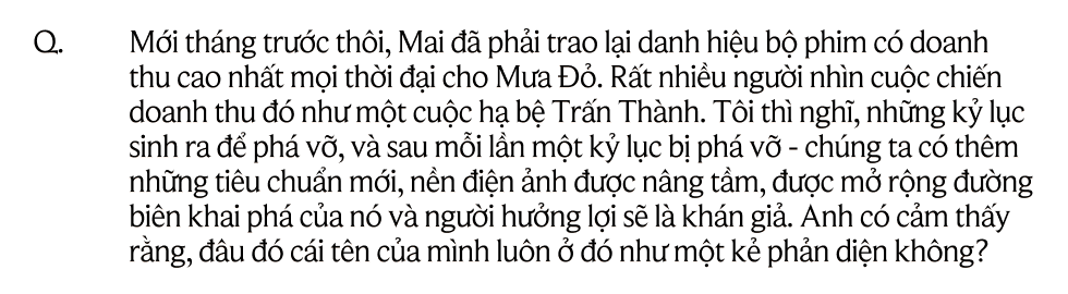 Rất nhiều. Thật ra, những kỷ lục sinh ra là để phá vỡ. Chưa gì đã có bộ phim phá vỡ kỷ lục của Mai rồi và điều đó khiến tôi có thêm động lực để tiếp tục làm những thứ tốt hơn. Càng đi xa, ta càng thấy mình nhỏ bé. Hãy nhìn ra điện ảnh thế giới xem họ đã đi được tới đâu rồi? Ngoài những bộ phim hay, tôi khao khát nâng cấp chất lượng sản xuất phim của Việt Nam. Điều đó cần đến từ việc nâng cấp máy móc, kỹ xảo, thậm chí lịch làm việc. Hiện nay các đoàn phim phải làm quá nhiều trong một ngày, đến mức độ các diễn viên và ekip đều rã rời và không còn tinh thần để cống hiến tốt hơn nữa. Nhưng nếu thêm ngày quay thì… tiền đâu để trả đây? Tôi rất mong ngành công nghiệp điện ảnh có thể phát triển mạnh mẽ hơn nữa để khi các nhà làm phim thu về một nguồn vốn đủ tốt, họ sẽ dám đầu tư mạnh hơn cho ngày quay được nhiều hơn, ekip có thêm thời gian nghỉ ngơi và tái tạo năng lượng thì chất lượng những bộ phim cũng sẽ đi lên.