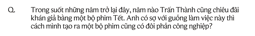 Tôi luôn có một kế hoạch cho cả một thập kỷ trước mắt. Vô tình đây lại là chặng đường mà tôi quyết định sẽ rồ ga chạy thật nhanh, và cũng nằm trong chuỗi của những bộ phim dễ chạm đến số đông khán giả. Mọi người hay dùng từ "phim thị trường" để dễ hình dung. Nhưng rồi cuối cùng phim thị trường là gì? Art là gì? Tại sao chúng ta phải chia nó ra làm 2 mà không có một cái ở giữa? Phim thị trường bán vé được thì người ta nói tính nghệ thuật không cao. Phim arthouse tính nghệ thuật cao nhưng lại rơi vào cảnh ế ẩm. Mắc gì ta phải khổ sở để tự đặt cho mình một áp lực làm chi vậy? Hãy làm một bộ phim vừa đảm bảo được về thẩm mỹ, về tính nghệ thuật nhưng vẫn bán vé được. Đó là tiêu chí của Trấn Thành. Tôi không dại gì chạy cho nhanh để chứng tỏ nghề nghiệp bằng cách thể hiện và trưng trổ, rồi cố làm những bộ phim arthouse trong thời điểm này.