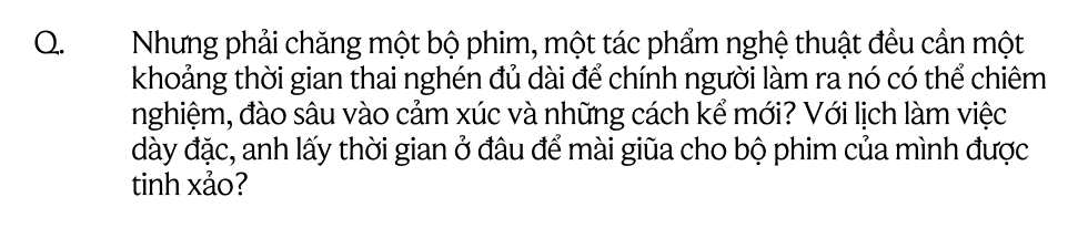 Đầu tiên thì phải coi mình còn chuyện để kể hay không đã. Nếu hết chuyện để kể và cứ phải lật đi lật lại bản thân hoài thì đó là lúc cần nghỉ ngơi để mà đi chiêm nghiệm đó. Nhưng may mắn là tôi đi làm suốt, và trong quá trình đi làm, tôi lại thấy được những chuyện mới và thôi thúc muốn được kể nó ra.