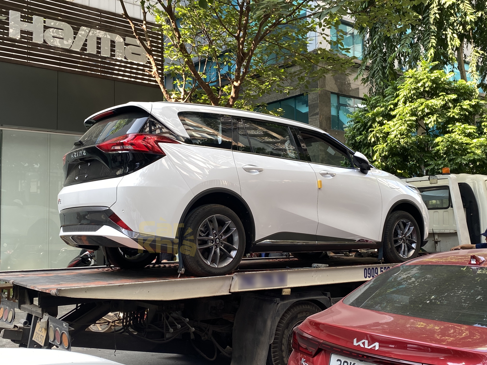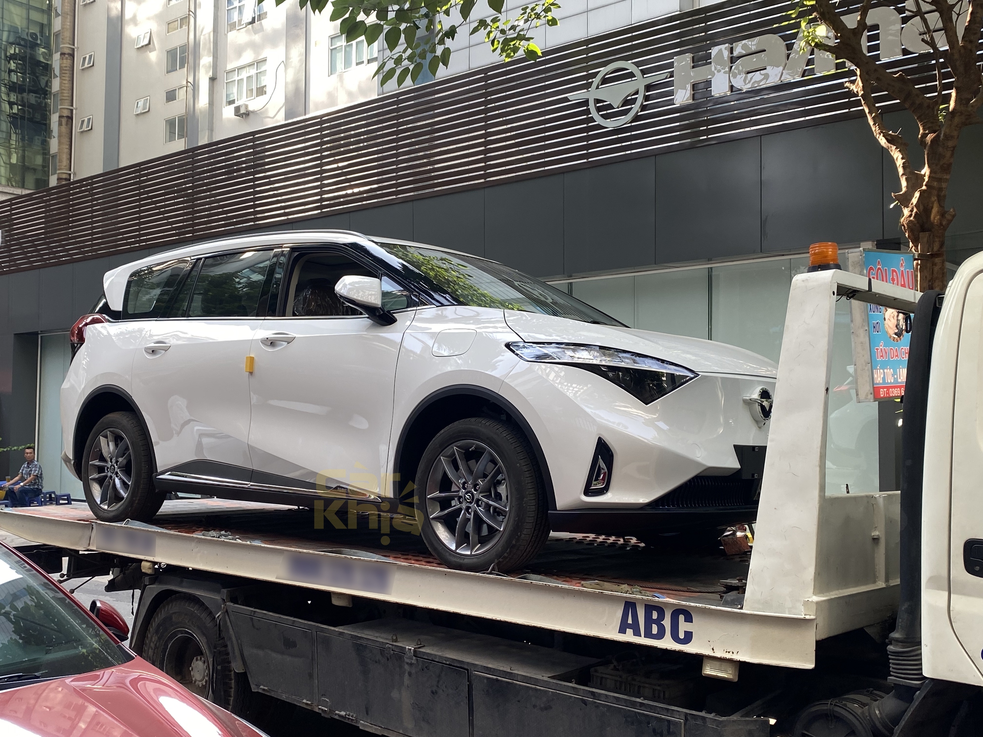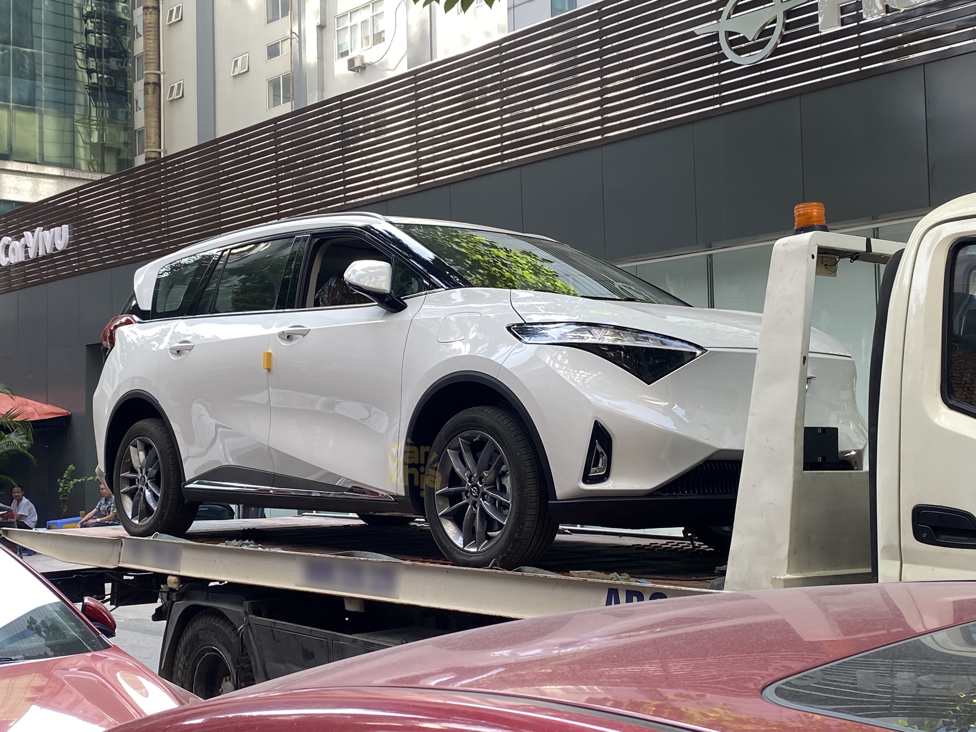 Sau lần xuất hiện tại lễ giới thiệu ô tô Haima tới các đối tác trong nước, mẫu MPV thuần điện Haima 7X-E tiếp tục lộ diện. Xe được vận chuyển trên xe cứu hộ trước cửa showroom CarVivu Hà Nội.